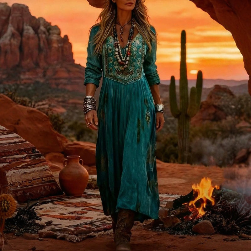 Fringilla - Uzun Vintage Ekose Süet Elbise